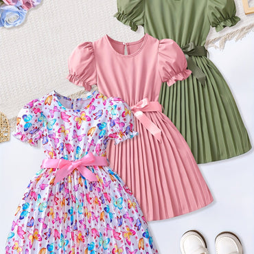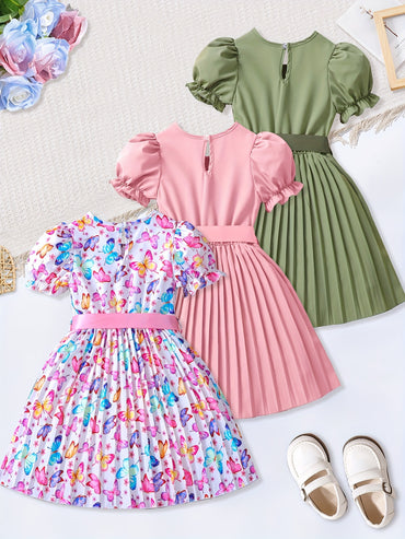 3pcs Girls' Summer Creative Butterfly and Solid Color Bubble Sleeve Pleated Midi Dresses - Crew Neck, Non-Stretch Woven Fabric, Brief Length, Perfect for Parties and Casual Outings, Party Dress|Butterfly Print|Nonstretch Fabri