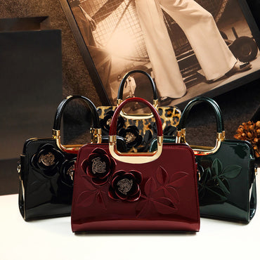 Women's Elegant Handbag - Zipper Closure, Burgundy/Black/Green, Sophisticated Everyday & Formal Purse for Women & Moms, Durable Polyester Lining & Oil Edging Finish, Floral Embroidery Design, Goldtoned Hardware