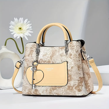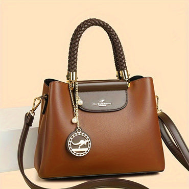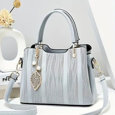 Stylish Women's Handbag with Adjustable Strap – Geometric Pattern Shoulder & Crossbody Bag in Khaki, Coffee, Apricot, or Burgundy – Elegant Leaf Charm & Zipper Closure