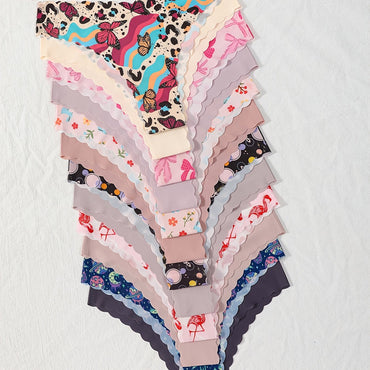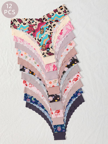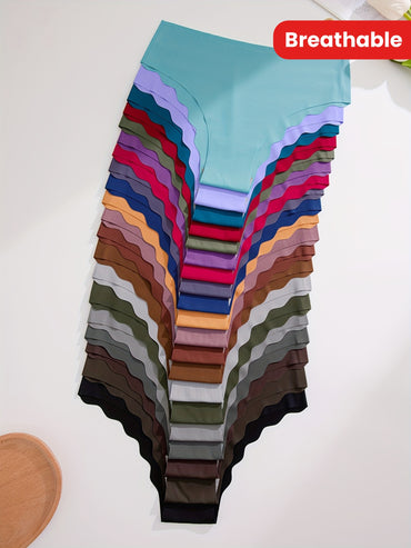 12pcs Women’s Seamless Wavy Bikini Panties - Soft, Comfortable, Low-Rise Hipster Underwear in Assorted Colors (Beige, Blue, Purple, Green, Pink, Black & More), Scalloped Edges for Smooth Fit, Breathable Nylon Blend Fabric