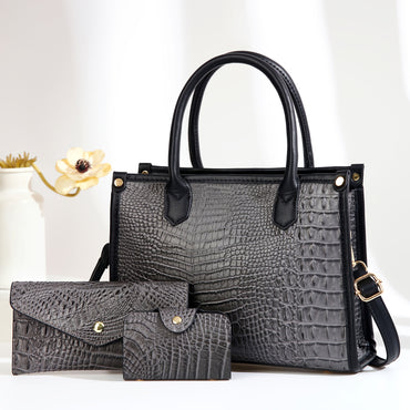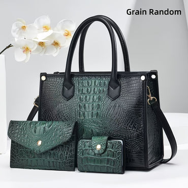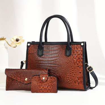 3 Pcs Crocodile Pattern Handbag & Purses Set, Multi-functional Vintage Top Handle Crossbody Bag & Business Clutch Bag & Card Coin Purse
