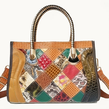 1pc New Women's Portable Color Block Patchwork Cowhide Handbag, Retro Splicing Design with Removable Shoulder Strap, Large Capacity, Imitation Crocodile & Snake Patterns, Geometric Pattern, Zipper Closure, Perfect for Daily Use & Stylish Outfits