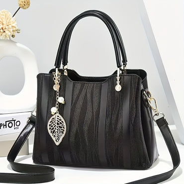 Stylish Women's Handbag with Adjustable Strap – Geometric Pattern Shoulder & Crossbody Bag in Khaki, Coffee, Apricot, or Burgundy – Elegant Leaf Charm & Zipper Closure