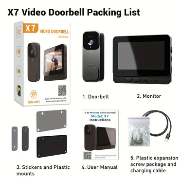 [WiFi-Free X7] 7" WiFi-Free X7 Video Doorbell | Night Vision, Local Storage, Wall Mount, Button Control, 1080P HD Camera, Motion Detection, Home & Office Security System, Visitor Monitoring, Durable Plastic Body