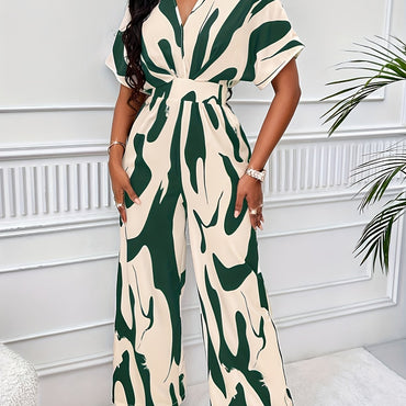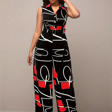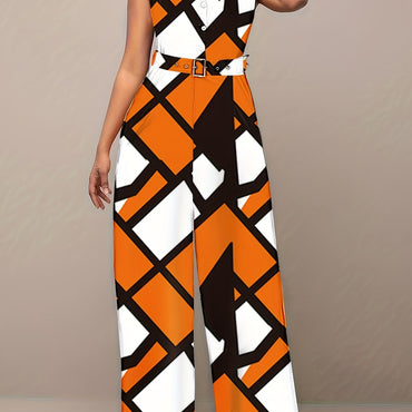 Elegant Geometric Print V-Neck Jumpsuit for Women, Polyester 100%, Sleeveless Wide Leg Unitard with Belt, Regular Fit, for Spring/Summer/Fall - Going Out