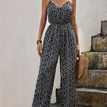 Vibrant Floral Print Wide Leg Jumpsuit - Backless, Spaghetti Strap, V Neck, Elegant Design for Spring & Summer - Women's Stylish Clothing for Outdoor Activities