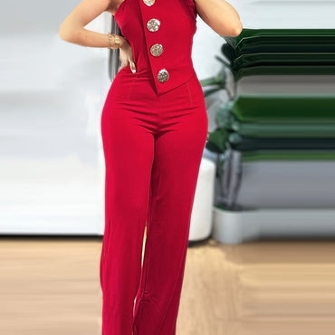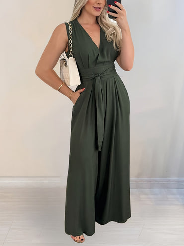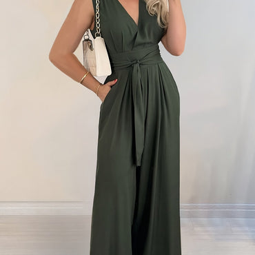 The Lady Has an Elegant Jumpsuit with a Belt.
