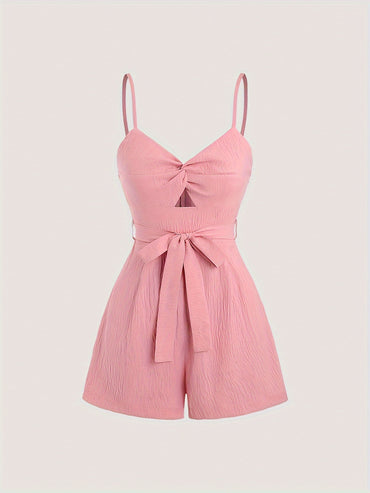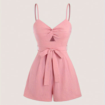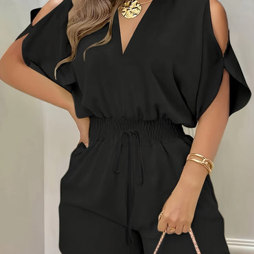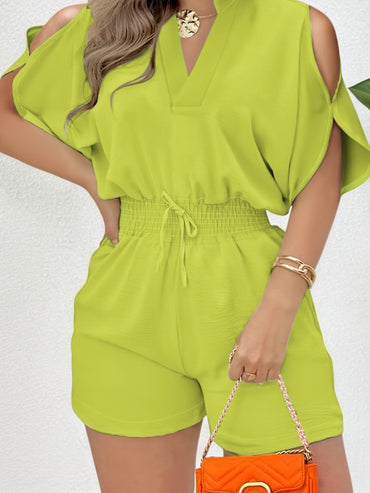 Vibrant V-Neck Romper Jumpsuit - Elegant Cold Shoulder, Cinched Waist, Short Sleeves, Comfortable Fabric - Perfect for Spring & Summer, Women's Fashion Clothing