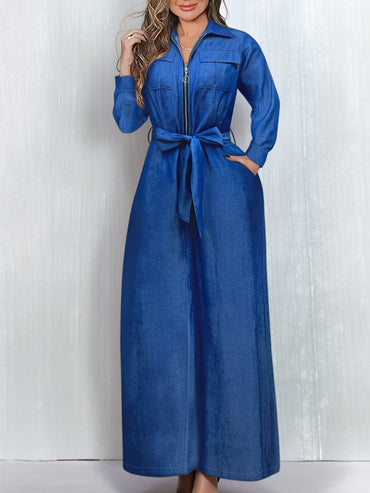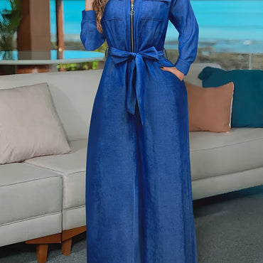 Elegant Long Sleeve Zip-Up Jumpsuit with Tie Waist for Women, Polyester, Solid Color, Machine Washable - Spring/Fall