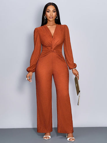 Elegant V-Neck Long Sleeve Jumpsuit for Women, 100% Polyester Knit Fabric, Twist Detail Side Zip Closure, Solid Color All-Season T-Shirt Style Jumpsuit