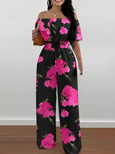 [Machine Washable Polyester Jumpsuit] Elegant Off-Shoulder Floral Print Jumpsuit for Women - Polyester, Machine Washable, Summer Fashion