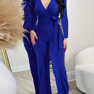 Long Sleeve Chic V-Neck Jumpsuit with Belt - Machine Washable, Casual Solid Color, Perfect for Spring/Fall Vacations