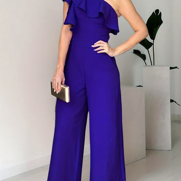 Chic One-Shoulder Ruffle Jumpsuit for Women - High Waist, Loose Fit, Solid Color, Perfect for Spring/Summer/Fall