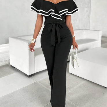 [Contrast Stripe] V-Neck Ruffle Sleeve Jumpsuit - 100% Polyester, Solid Color with Contrast Stripe, Long Length Straight Leg - For Women, Weekend Casual Style