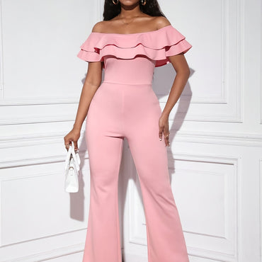 Elegant Pink Off-Shoulder Ruffle Jumpsuit for Women - Stretchy Polyester Blend, Straight-Leg Design with Zip Back Closure, Perfect for Spring/Summer Events
