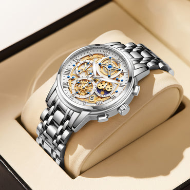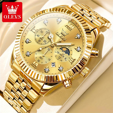 Stainless Steel OLEVS Men Watch Chronograph Roman Numerals Moon Phases Analog Quartz Watch