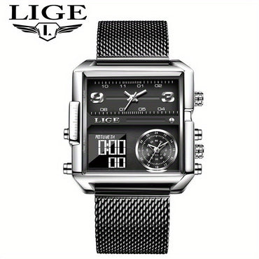 Lige Fashion Luxury Women's/Men's Watch. Square Stainless Steel Strap Watches. Dual Display Night Light Seconds Timer Sports Outdoor Wristwatches. Suitable For Giving Gifts During Holidays.