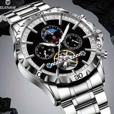 [GLENAW Mechanical Watch] GLENAW Men's Automatic Mechanical Watch - 1pc Stainless Steel Strap, Round Zinc Alloy Case, Rhinestone Accents, Calendar, Date & 24 Hours Display, 30m Water Resistant, Self-Winding Movement