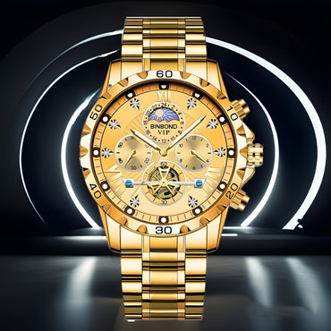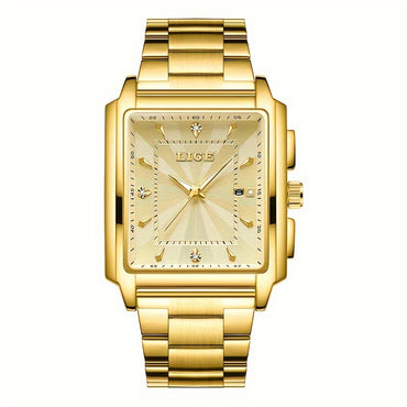 YaLaLuSi Men's Golden-Tone Quartz Watch with Calendar, Night Light, and Chronograph Functions - Stylish Streetwear Design, Durable Alloy Strap, Includes Strap Adjuster & Gift Box - Perfect Gift for Father, Boyfriend, or Friends