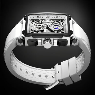 Elegant Men's Golden-Tone Tonneau Watch with Intricate Mechanical Design - Stainless Steel, Luminous Hands & Date Display, Stopwatch Function, Water-Resistant