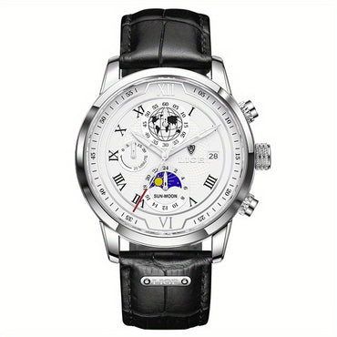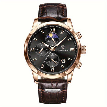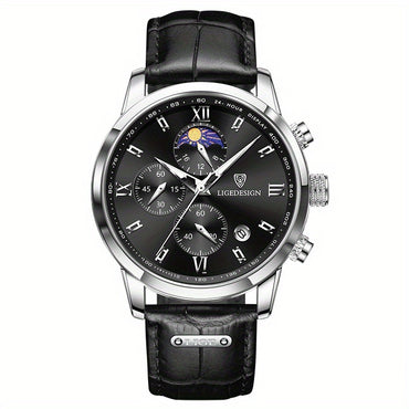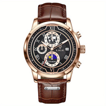 LIGE High-grade Men's Quartz Watch Men's Business Clock Multi-function Chronograph Watch 30m Life Lunar Phase Calendar Clock, Ideal choice for Gifts