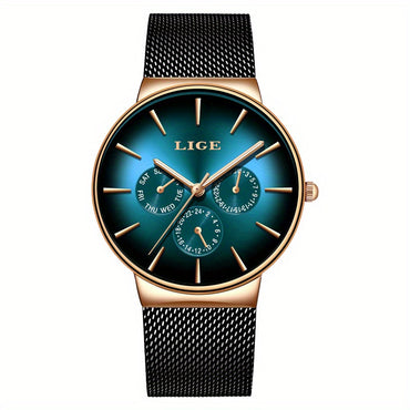 LIGE Fashion Men's Watch Top Brand Luxury Quartz Watch, Men's Mesh Steel Ultra-thin Men's Sports Watch Multi-Functional Movement Visual Calendar Week 24 Hours, Ideal choice for Gifts