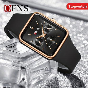 OFNS Fashion Square Quartz Watch, 50m Waterproof, 24-Hour Display, Soft Silicone Strap for Casual Style