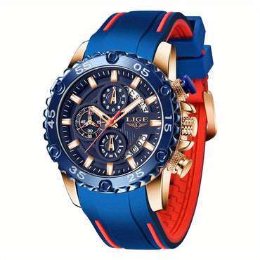 LIGE Luminous Men's Sports Watch - 30m, Chronograph Quartz Wristwatch with Black Silicone Strap, Red Accents, for Outdoor &