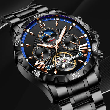 GLENAW Men's Automatic Mechanical Watch - Rose Golden Case, Black Dial, Stainless Steel Band, 24-Hour Date Display, Party Style with Rhinestone Details, Water-Resistant up to 30m, Formal Wear Watch | Rhinestone Embellishments | Zinc Alloy Case