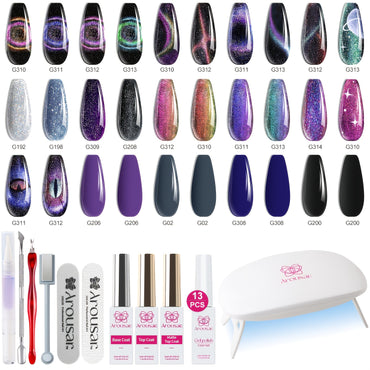 Arousar Cat Eye Gel Polish Set, 16pcs Chameleon Gel Nail Polish Black Purple Glitter Silvery Changing Magic Galaxy Effect Kit With Base Top Coat, LED Nail Lamp, Cuticle Oil And Manicure Tools Valentine'S Day Gift For Women And Girls