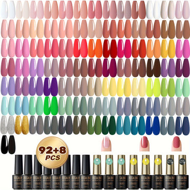 ROSALIND 100PCS Gel Nail Polish Set 92 PCS Colors Soak Off UV Gel Polish White Nude Pink Classic Color Gel Nail Set With 8 Bottles Of Base And Glossy Matte Top Coat Nails Gift Nail Art Starter Nail Polish Set