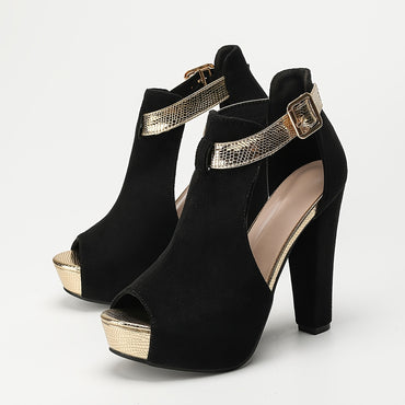 Women's Elegant Black Cover & Golden Ankle Strap High Heels - Thick Platform Open-Toe Summer Shoes with Rhinestone Accents, Ultra-High Block Heels & TPU Sole for Parties, Weddings, Formal Events, Formal Footwear | Stylish Cover Shoes | Synthetic Cover Sho