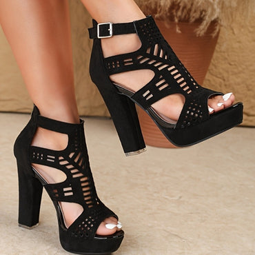 New Summer Plus-Size Women'S with Thick Heels, Hollow Design, Stunning High Heels Perfect for Skirts, Adorned with Rhinestones And Studs, Featuring a Waterproof Platform.