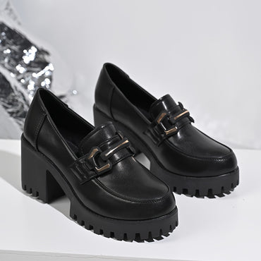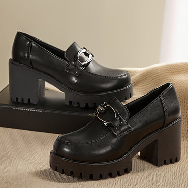 2024 New Women's Slip-On Chunky Heel Platform Pumps - Black Synthetic Cover Comfortable Round-Toe Shoes with Fabric Lining & PU Sole, Versatile All-Season Dress Shoes for Casual & Formal Occasions, Modern Shoe Design, Durable Footwear, Minimalist Design,