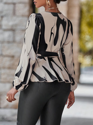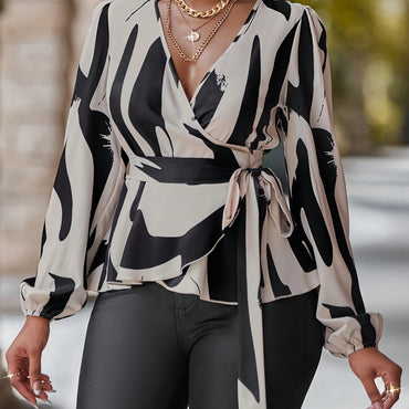 Machine Washable Polyester Elegant Printed Lantern Sleeve Blouse with Tie-Waist - Perfect for Spring/Summer/Fall