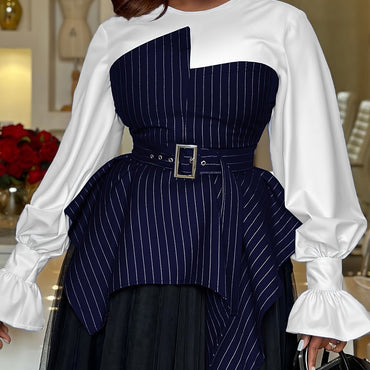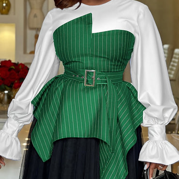 Plus Size Women's Elegant Striped Panel Asymmetrical Hem Blouse with Belt - Long Sleeve, Green & White Vertical Stripes, Round Neck, Polyester, Ruffled Cuffs, Layered Skirt Design, Perfect for Office or Casual Outfits