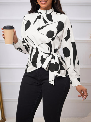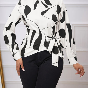 Women's Elegant Printed Side Tie Long Sleeve Shirt Top - Polyester Woven Fabric, Round Neck - Autumn/Winter Fashion - For Women - Perfect for Casual & Formal Occasions