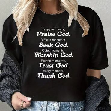 Women's Praise God Print T-Shirt - Casual Crew Neck Short Sleeve Top, Spring & Summer Collection, White with Inspirational Quote "Happy Moments... Difficult Moments... Seek God... Worship God... Trust in God... Every Moment... Thank You God"