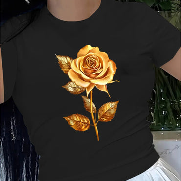 Elegant Golden Rose Print T-Shirt for Women, 100% Knit Fabric, Sleeveless Floral Pattern, Soft Comfortable Short Sleeve Design, Machine Washable, with Stretch Fit for All Seasons, Casual Wear | Elegant Design