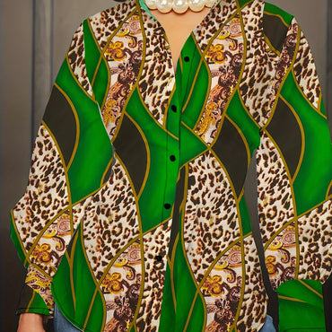 Tribal Print Button Up Shirt, Elegant Long Sleeve Collared Shirt For Spring & Fall, Women's Clothing