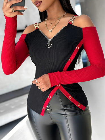 [Casual Cold Shoulder T-Shirt] 1pc Casual Cold Shoulder Long Sleeve T-Shirt - Knitted Polyester, Color Block Zipper Detail, Regular Length, Solid Color Design for Spring/Autumn