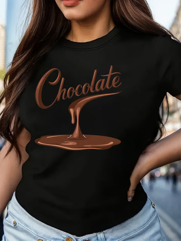 [Chocolate Print Polyester T-Shirt] Women's Casual Crew Neck T-Shirt with Chocolate Print, 100% Polyester Knit Fabric, Short Sleeve Top for All Seasons, Spring & Summer