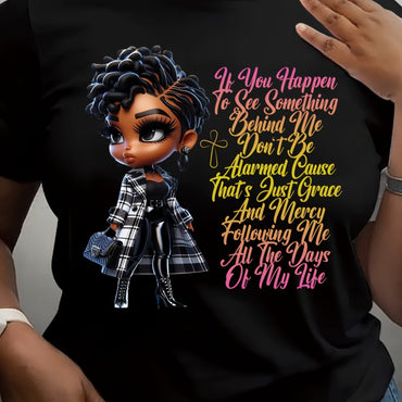 Women'S Plus Size Cartoon Character Graphic T-Shirt with Slogan Print, Casual Round Neck Short Sleeve Top, Polyester and Elastane Blend, Machine Washable, Letter Print, Fashion