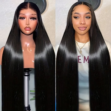 Luxurious 40" Kinky Straight Lace Front Wig for Women - Brazilian Human Hair, Pre-Plucked with Baby Hair, 200% Density, Yaki Texture, 13x4.5 Lace, Natural Black, Wigs, Straight