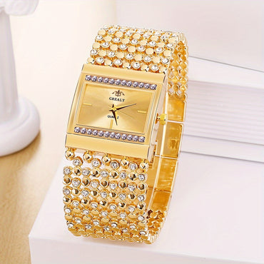 [Fashionable Quartz Wrist Watch] Elegant Square Case Quartz Wrist Watch - Fashionable Women's Accessory with Crystal-Embellished Alloy Bracelet, Electronic Pointer Display