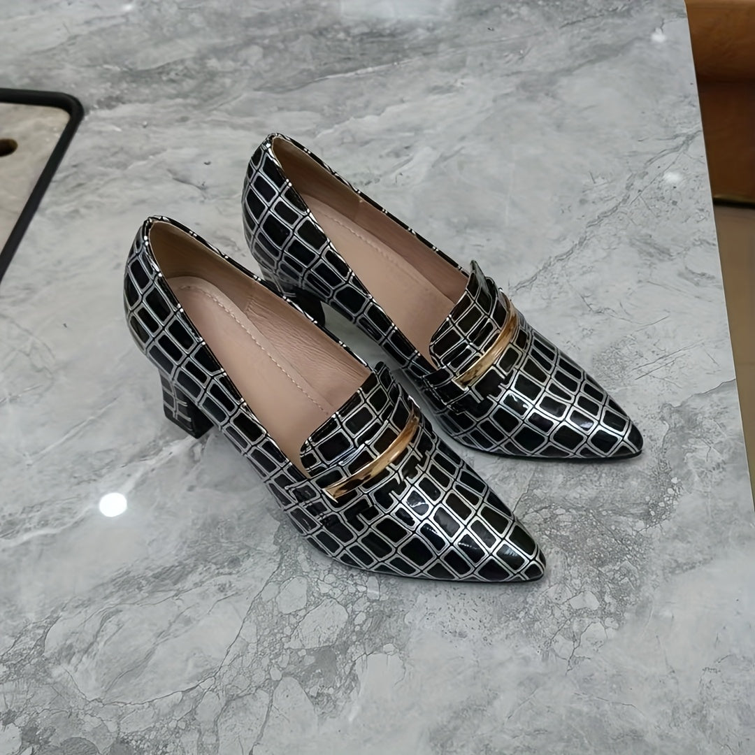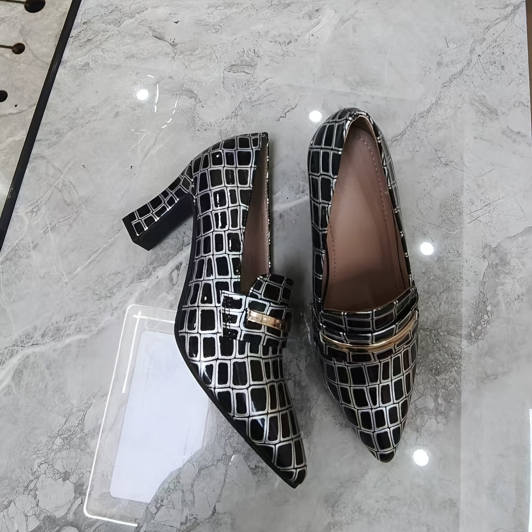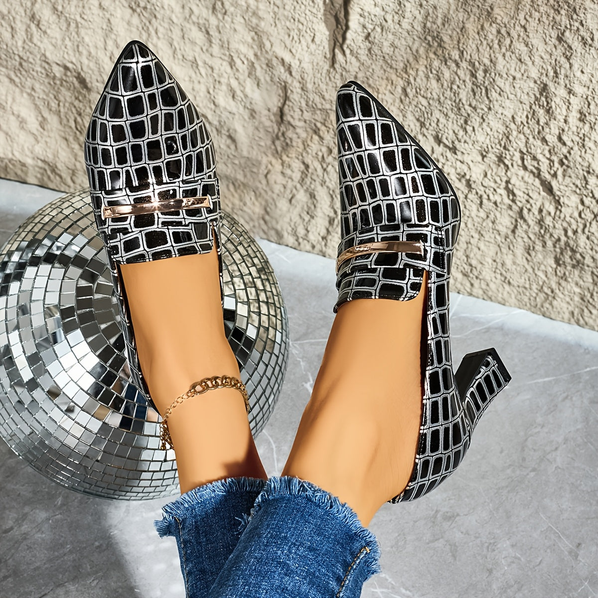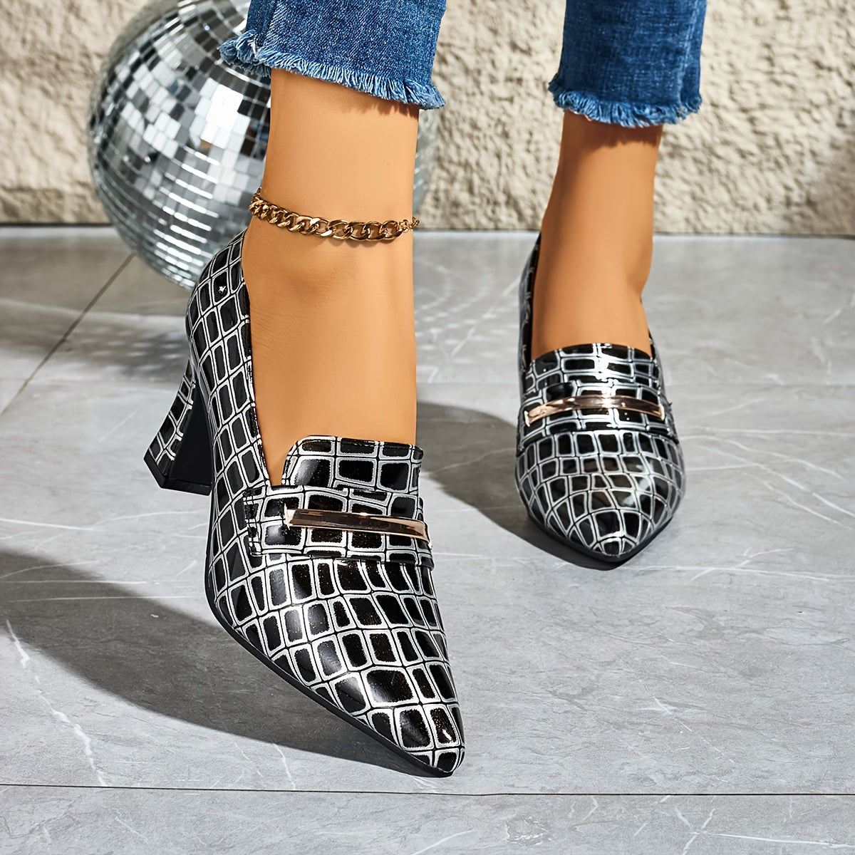 1 Pair Fashion French Style High Heel Mary-Jane Pumps for Women - Checkered Crocodile Pattern, Pointed Toe, Block Heel, Lightweight, Comfortable, TPU Sole, Man-Made Materials, Versatile for All Seasons