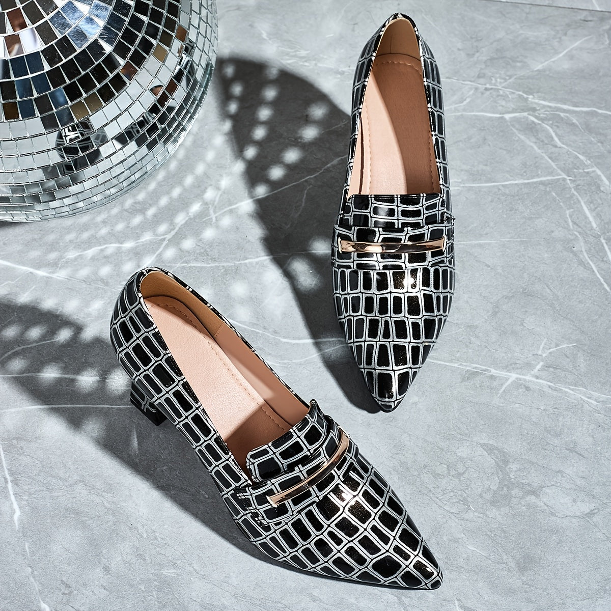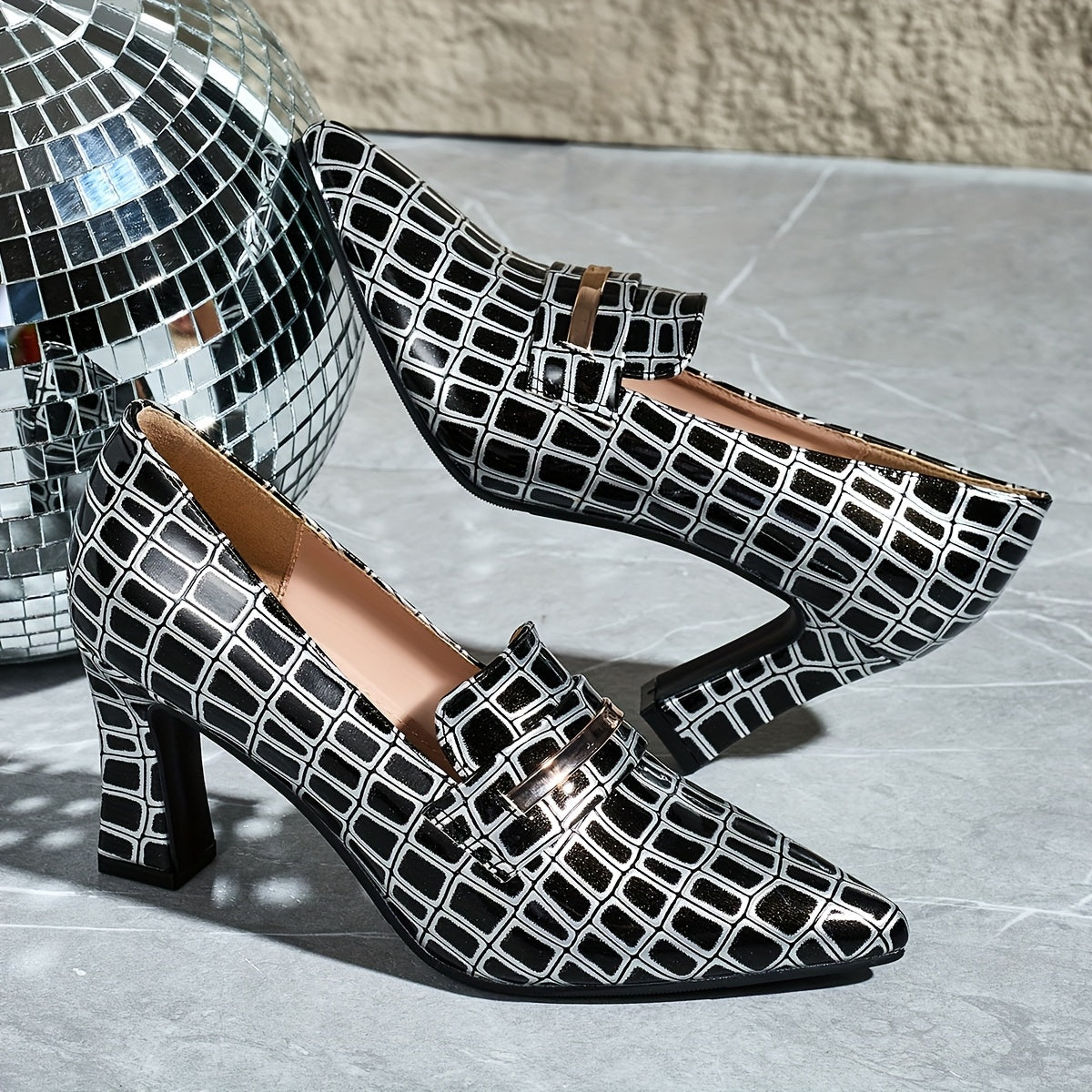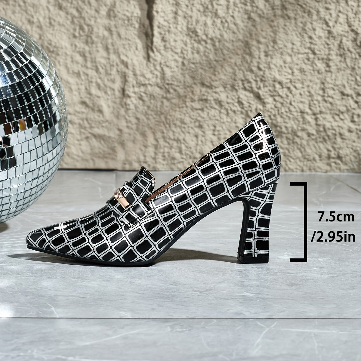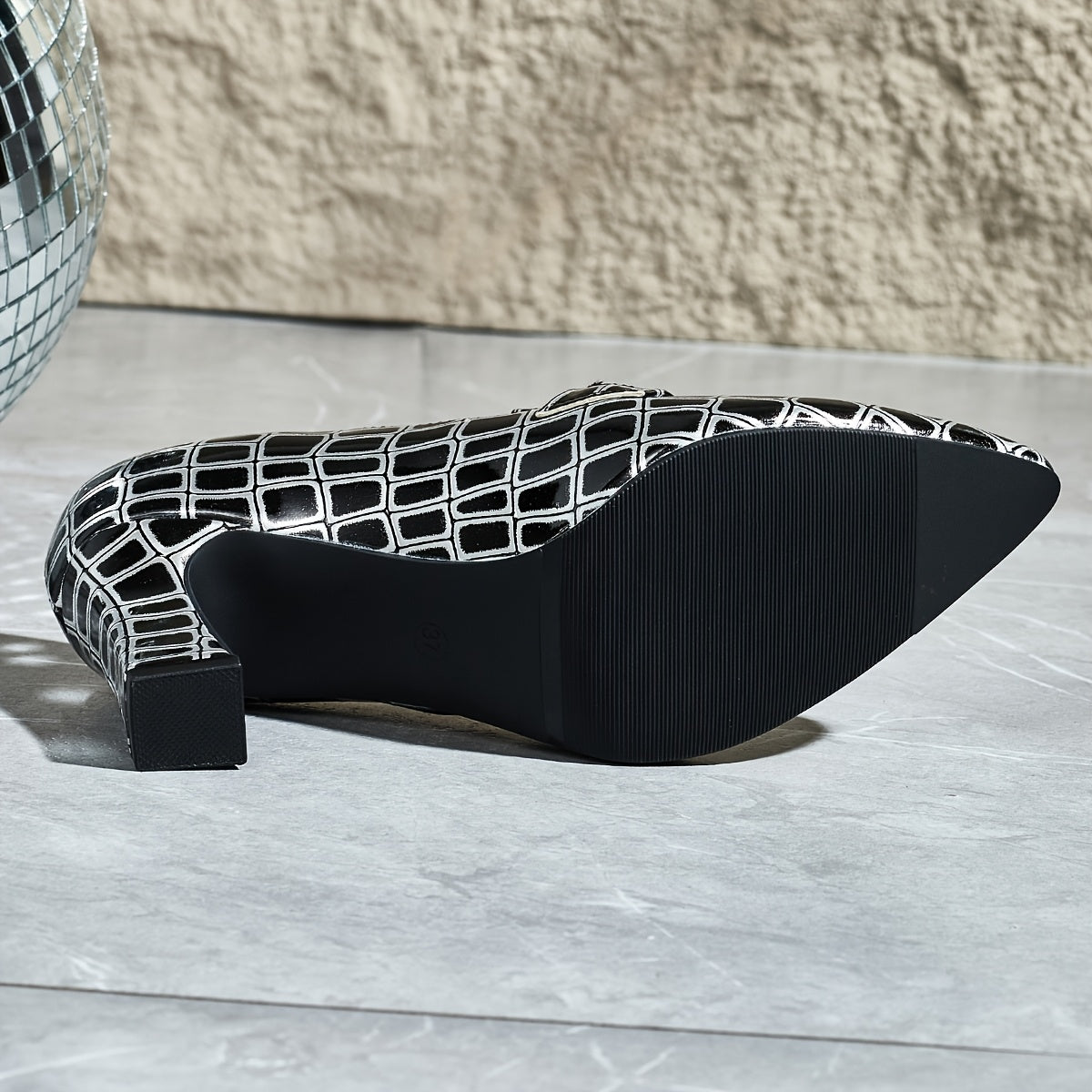 1 Pair Fashion French Style High Heel Mary-Jane Pumps for Women - Checkered Crocodile Pattern, Pointed Toe, Block Heel, Lightweight, Comfortable, TPU Sole, Man-Made Materials, Versatile for All Seasons