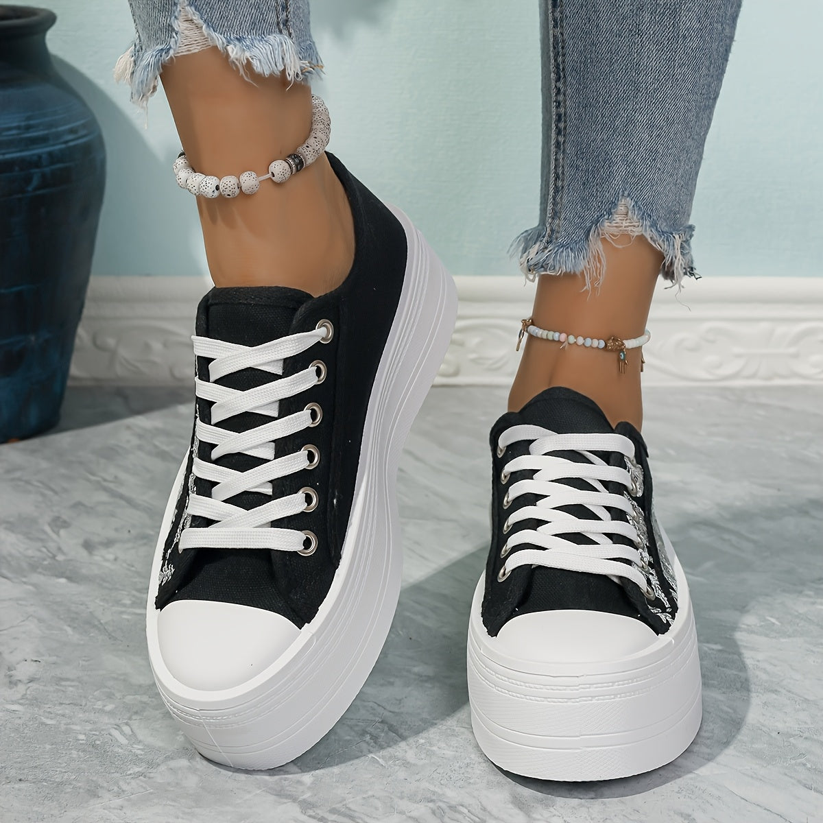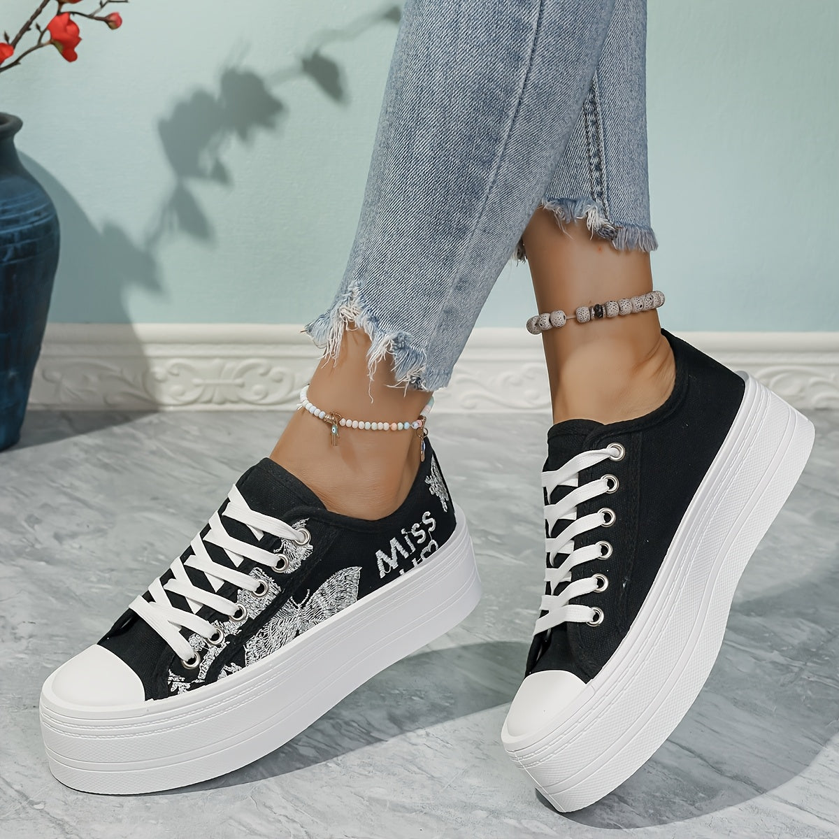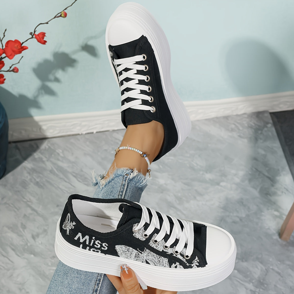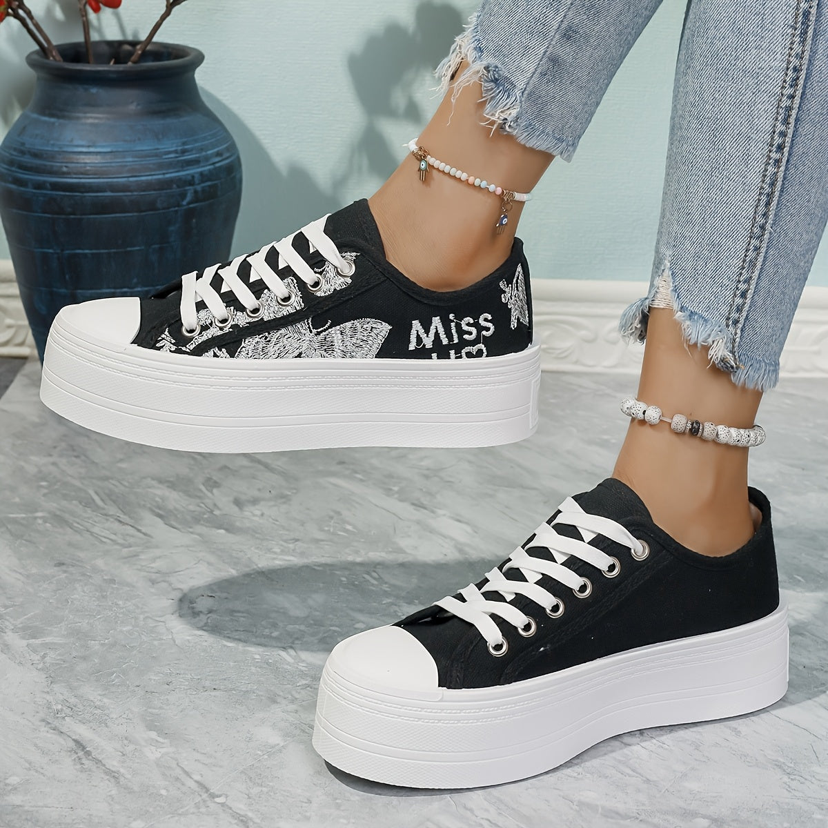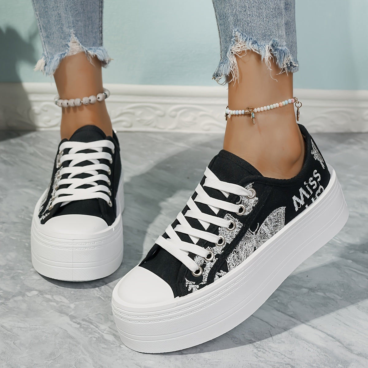 1 Pair Women'S Embroidered Canvas Sneakers, Non-Slip Stabilizing All-Season Thick Sole Fashion Shoes with Fabric Insole