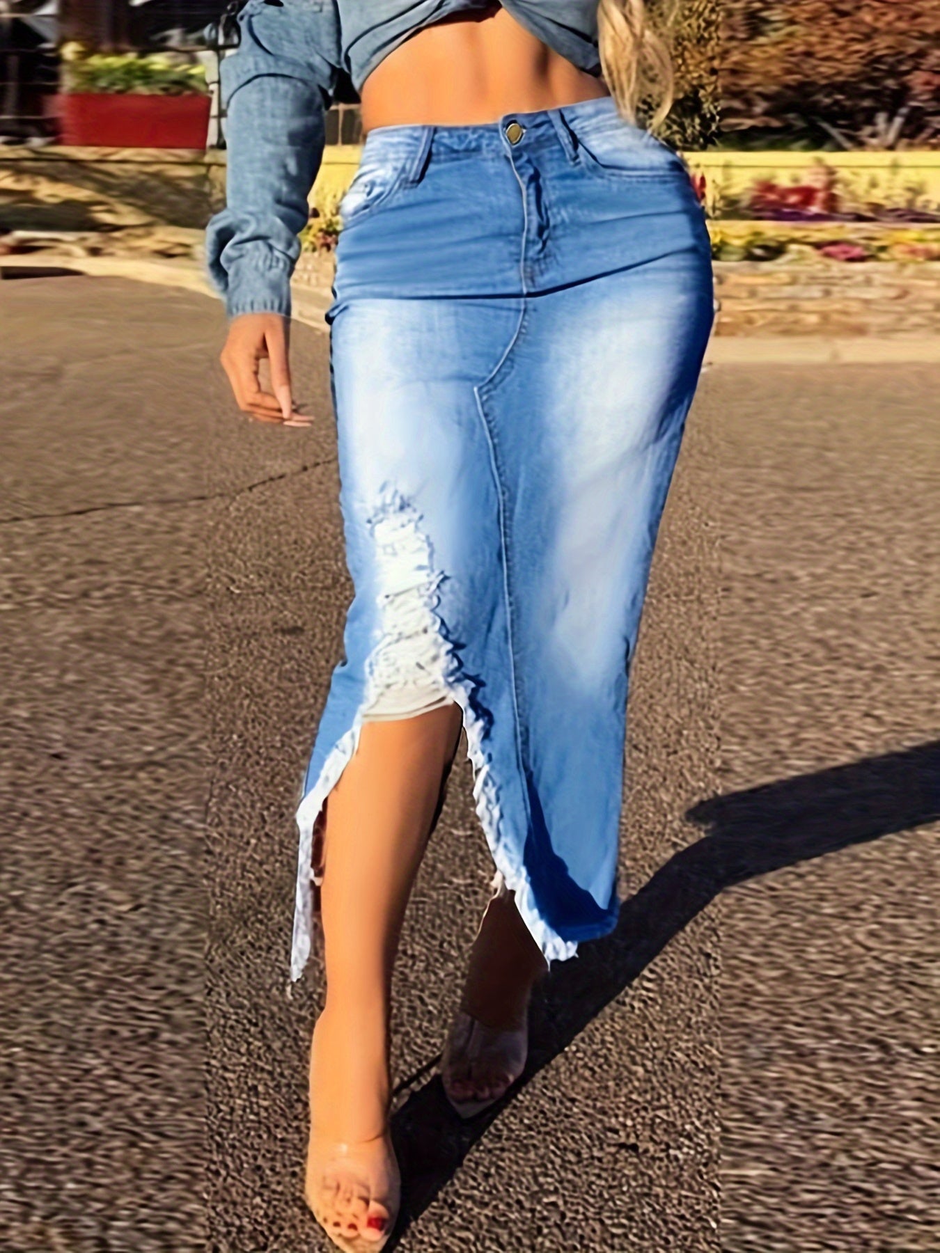 1. Women's Distressed Denim Skirt - High Waist Stretch Fitted Mid-Length Skirt with Edgy Ripped Detail - Light Blue Casual Skirt for Spring, Summer, and Fall 2. Stylish Women's Denim Skirt - Rayon Blend Stretch Fabric - Distressed Design - Machine Washabl