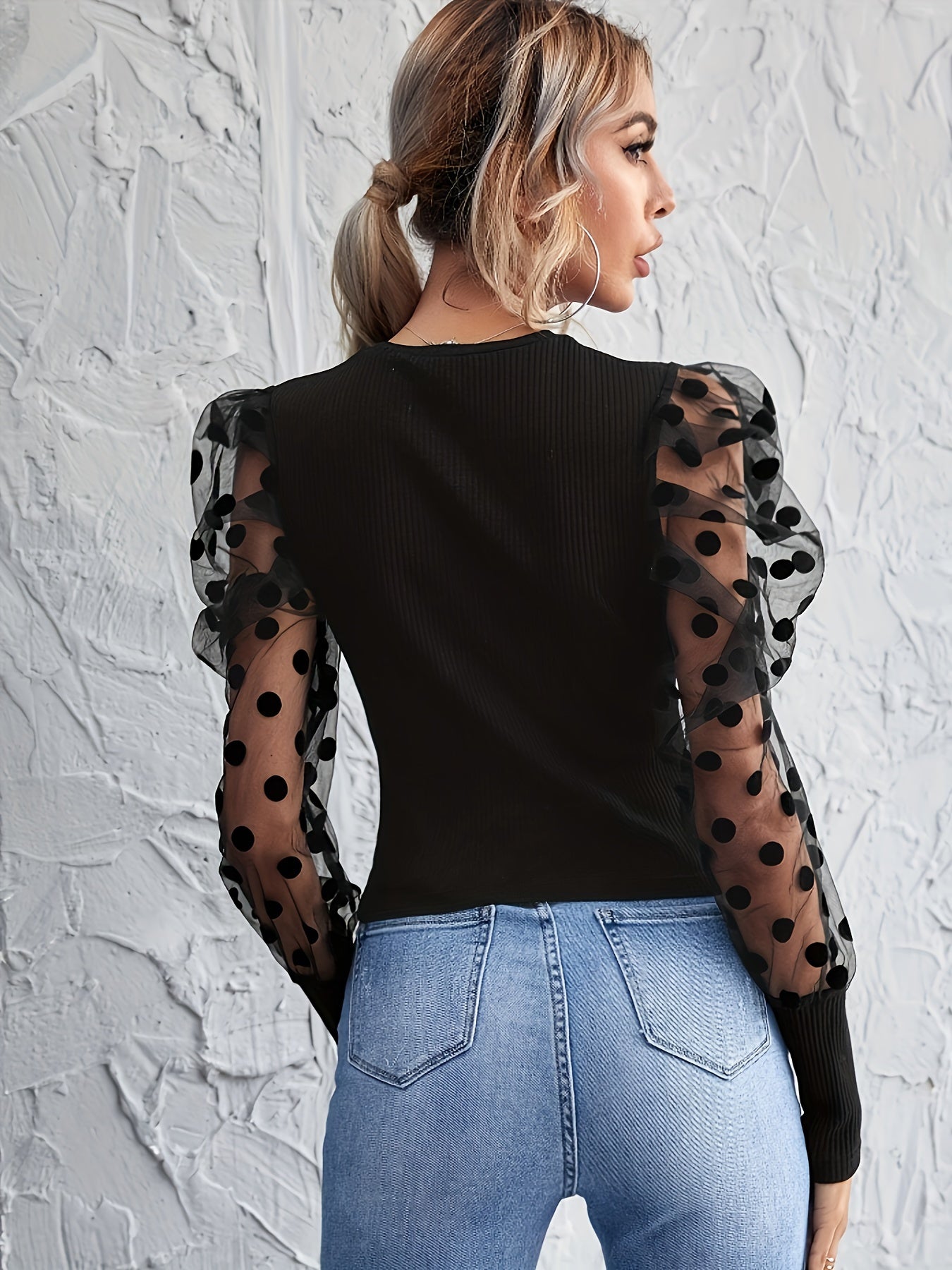 100% Polyester Elegant Polka Dot Bishop Sleeve T-Shirt for Women - Crew Neck Top with Sheer Sleeves, Knit Fabric, Ideal for Spring/Summer/Fall